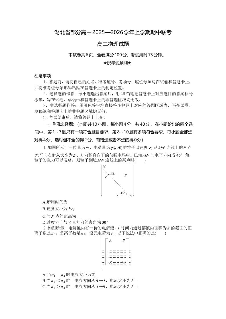高二物理(原卷版)--湖北省部分高中联考2025-2026学年高二上学期11月期中