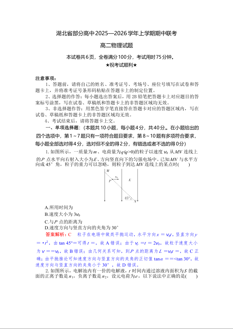 高二物理(解析版)--湖北省部分高中联考2025-2026学年高二上学期11月期中