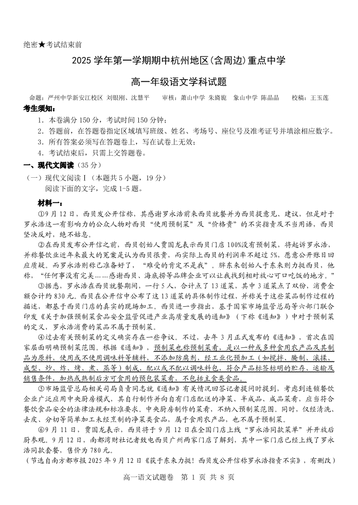 高一语文--浙江省杭州市地区(含周边)重点中学2025学年第一学期高一年级期中考试