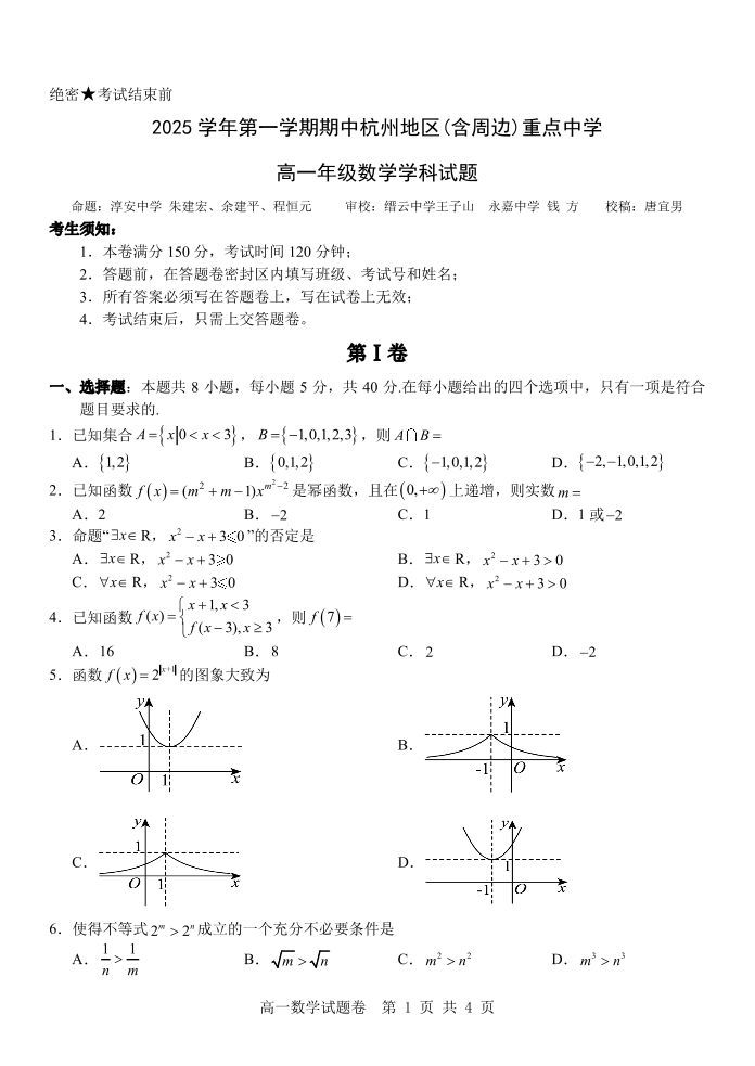 高一数学--浙江省杭州市地区(含周边)重点中学2025学年第一学期高一年级期中考试