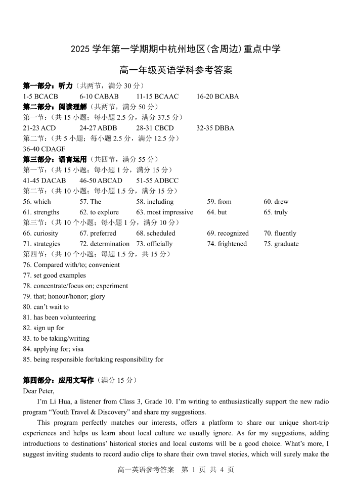 高一英语答案--浙江省杭州市地区(含周边)重点中学2025学年第一学期高一年级期中考试