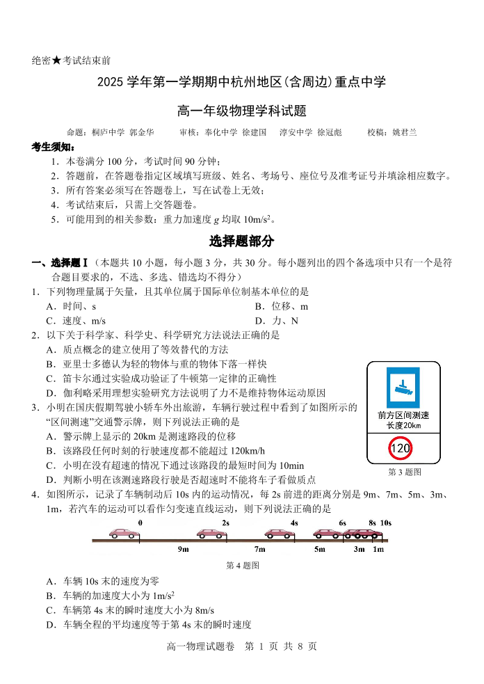 高一物理--浙江省杭州市地区(含周边)重点中学2025学年第一学期高一年级期中考试