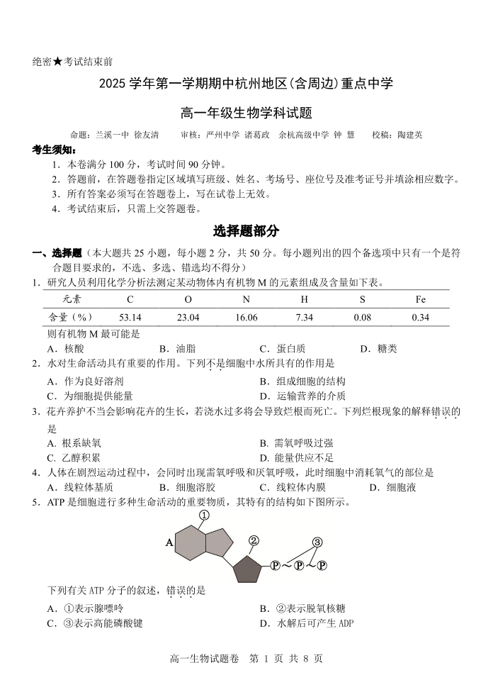 高一生物--浙江省杭州市地区(含周边)重点中学2025学年第一学期高一年级期中考试
