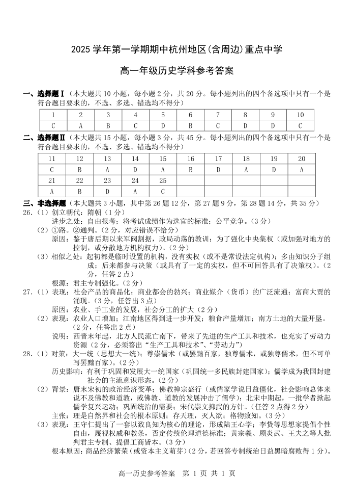 高一历史答案--浙江省杭州市地区(含周边)重点中学2025学年第一学期高一年级期中考试
