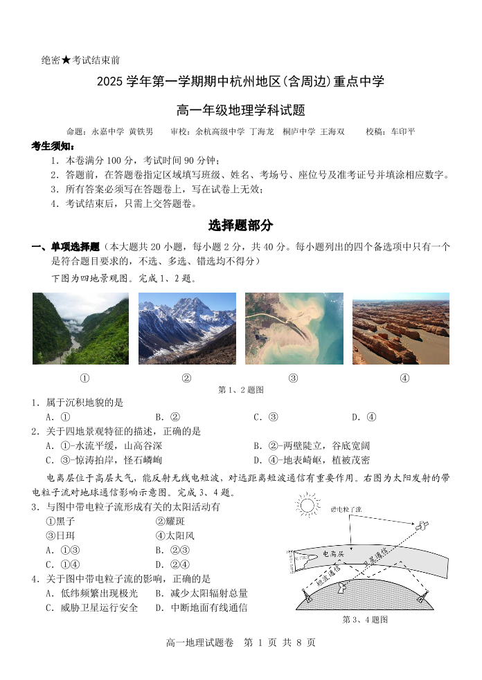 高一地理--浙江省杭州市地区(含周边)重点中学2025学年第一学期高一年级期中考试