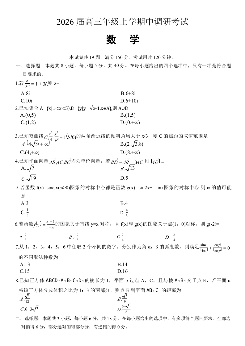 高三数学--河北省9+1联盟2026届高三上学期12月期中联合调研测评