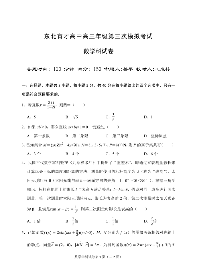 高三数学--辽宁省沈阳市东北育才学校2026届高三上学期第三次模拟考试