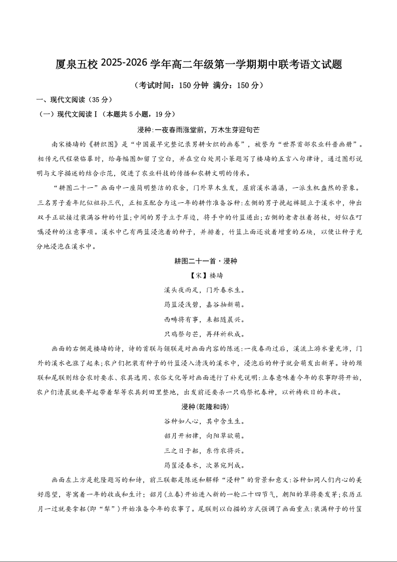 高二语文+答案--福建省厦泉五校2025-2026学年高二上学期期中联考
