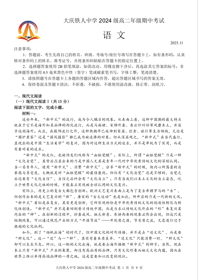 高二语文--黑龙江省大庆铁人中学2025-2026学年高二上学期期中考试