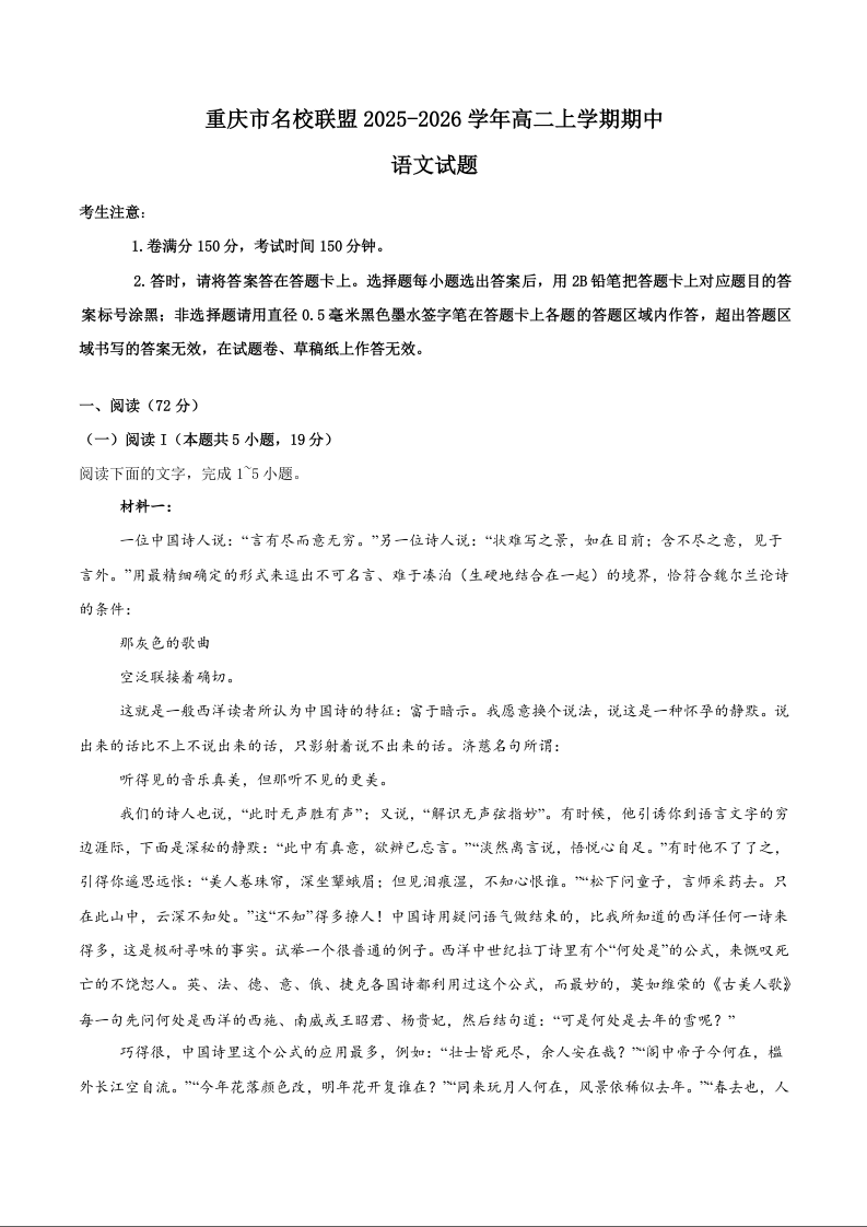 高二语文+答案--重庆市名校联盟2025-2026学年高二上学期11月期中联考