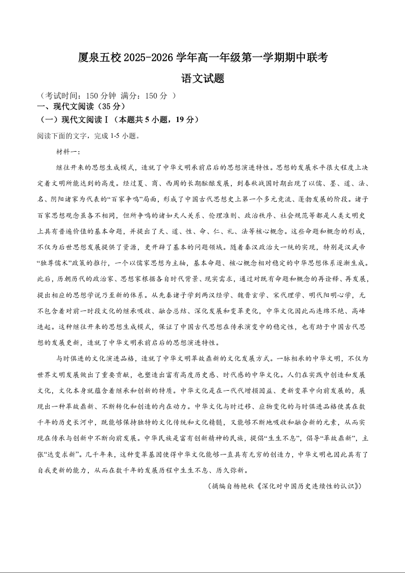 高一语文+答案--福建省厦泉五校2025-2026学年高一上学期期中联考
