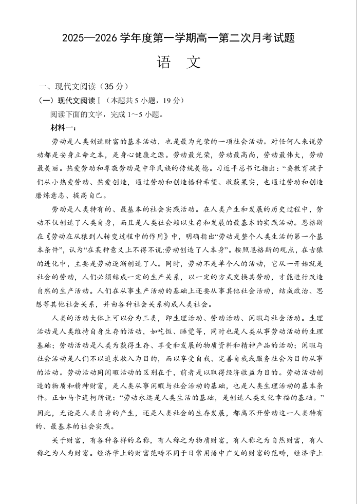 高一语文--海南省文昌中学2025-2026学年高一上学期第二次月考