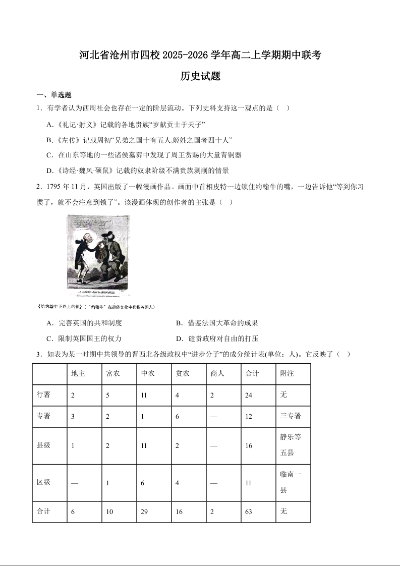 高二历史+答案--河北省沧州市四校2025-2026学年高二上学期期中考试