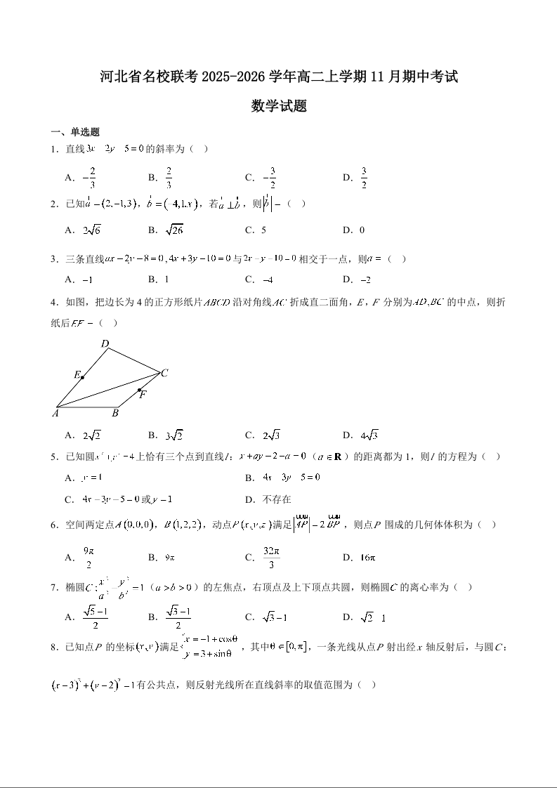 高二数学+答案--河北省名校联考2025-2026学年高二上学期期中考试