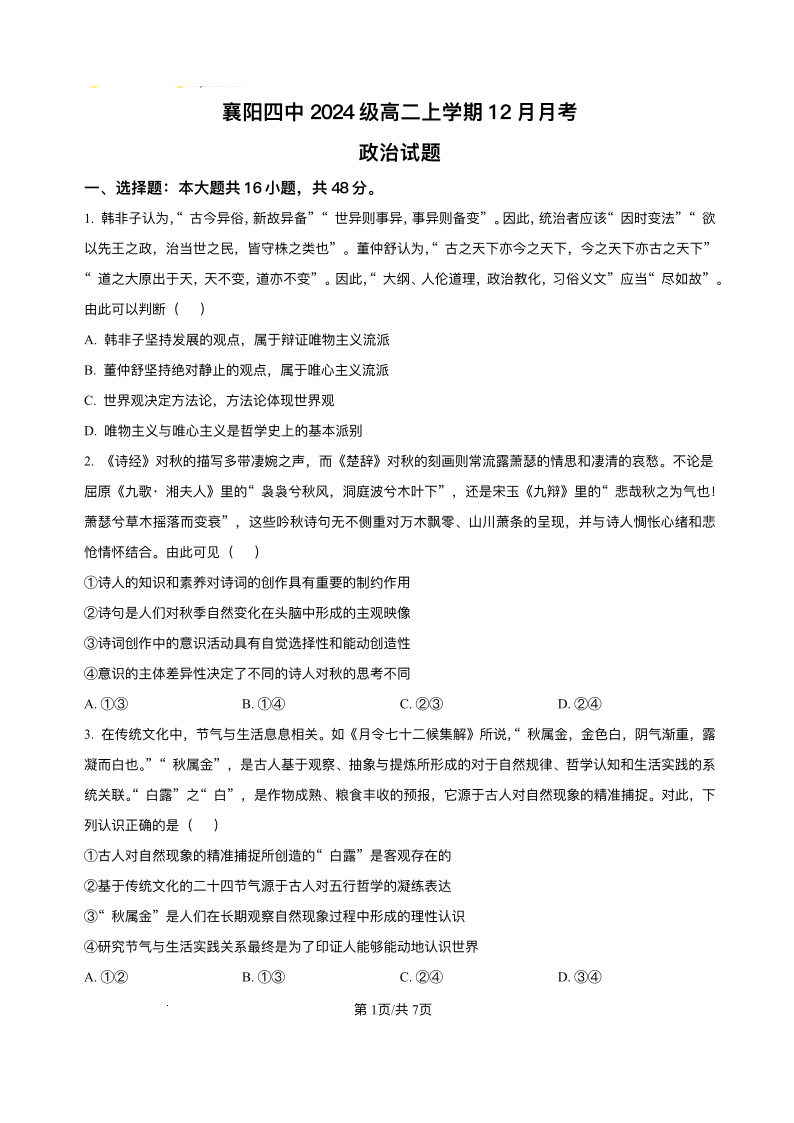 高二政治+答案--湖北省襄阳市第四中学2025-2026学年高二上学期12月月考