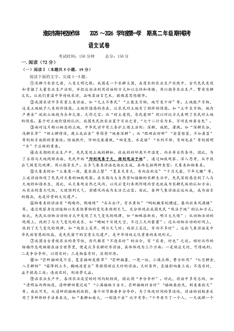 高二语文+答案--江苏省淮安市高中校协作体2025-2026学年高二上学期期中联考