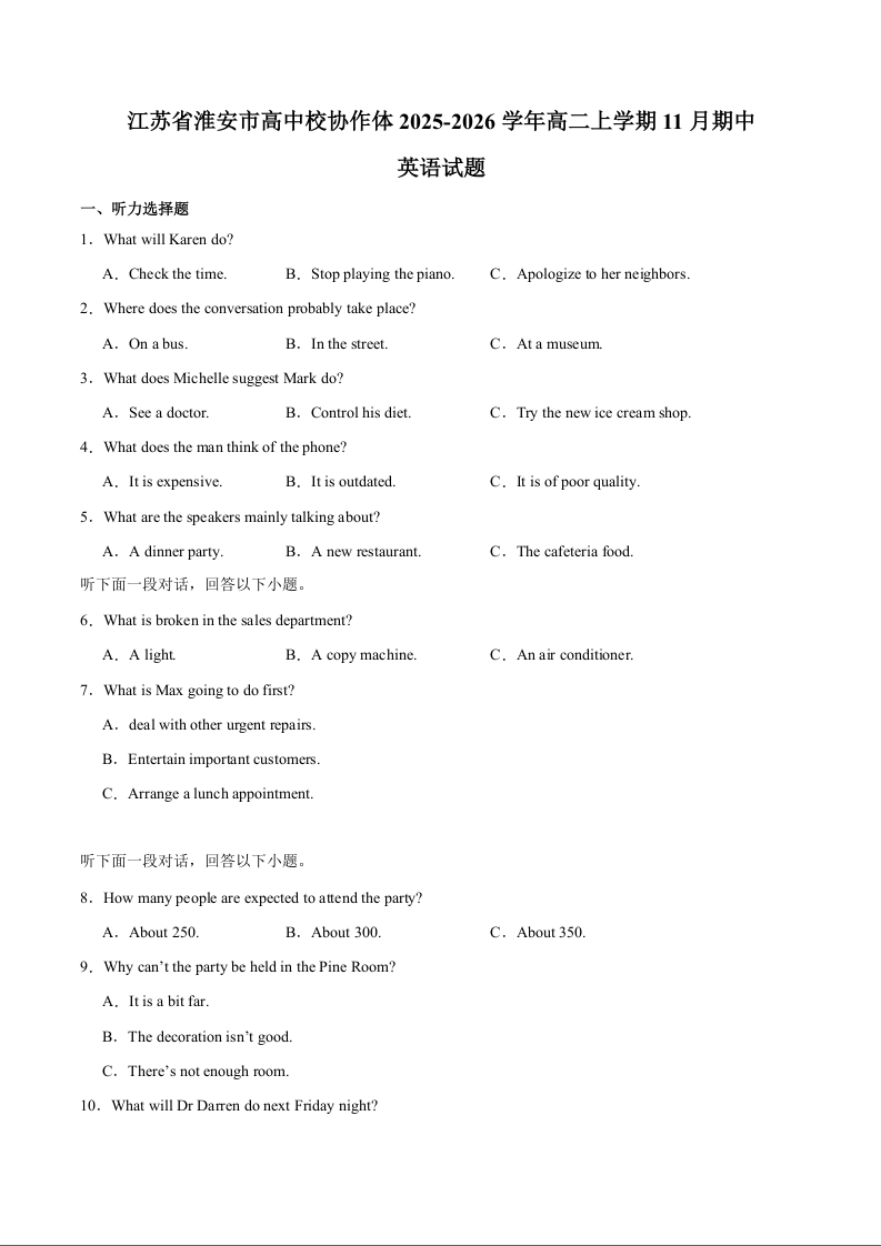 高二英语+答案--江苏省淮安市高中校协作体2025-2026学年高二上学期期中联考