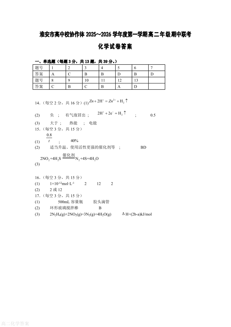 高二化学答案--江苏省淮安市高中校协作体2025-2026学年高二上学期期中联考