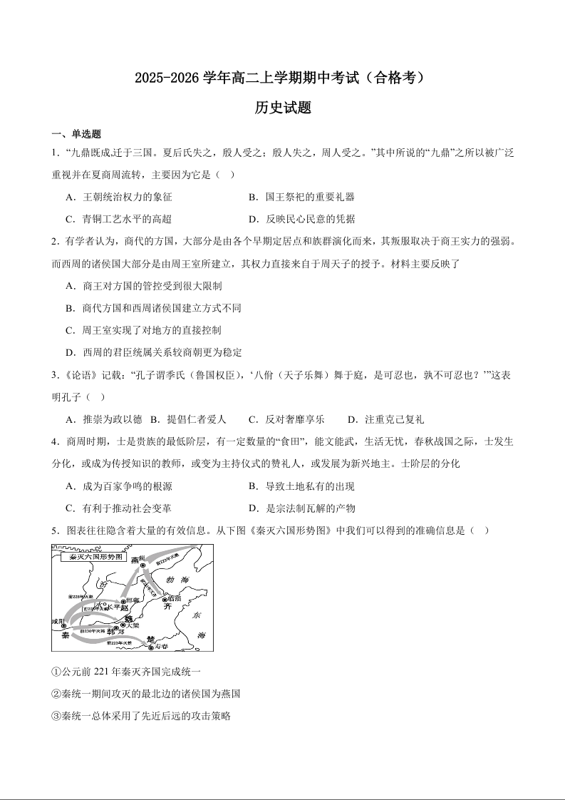 高二历史+答案--江苏省淮安市高中校协作体2025-2026学年高二上学期期中联考