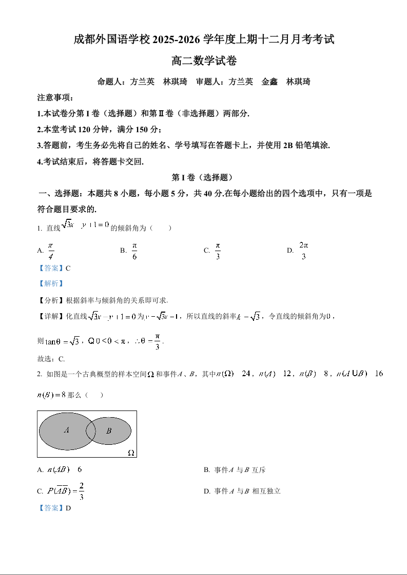 高二数学(解析版)--四川省成都外国语学校2025-2026学年高二上学期12月月考