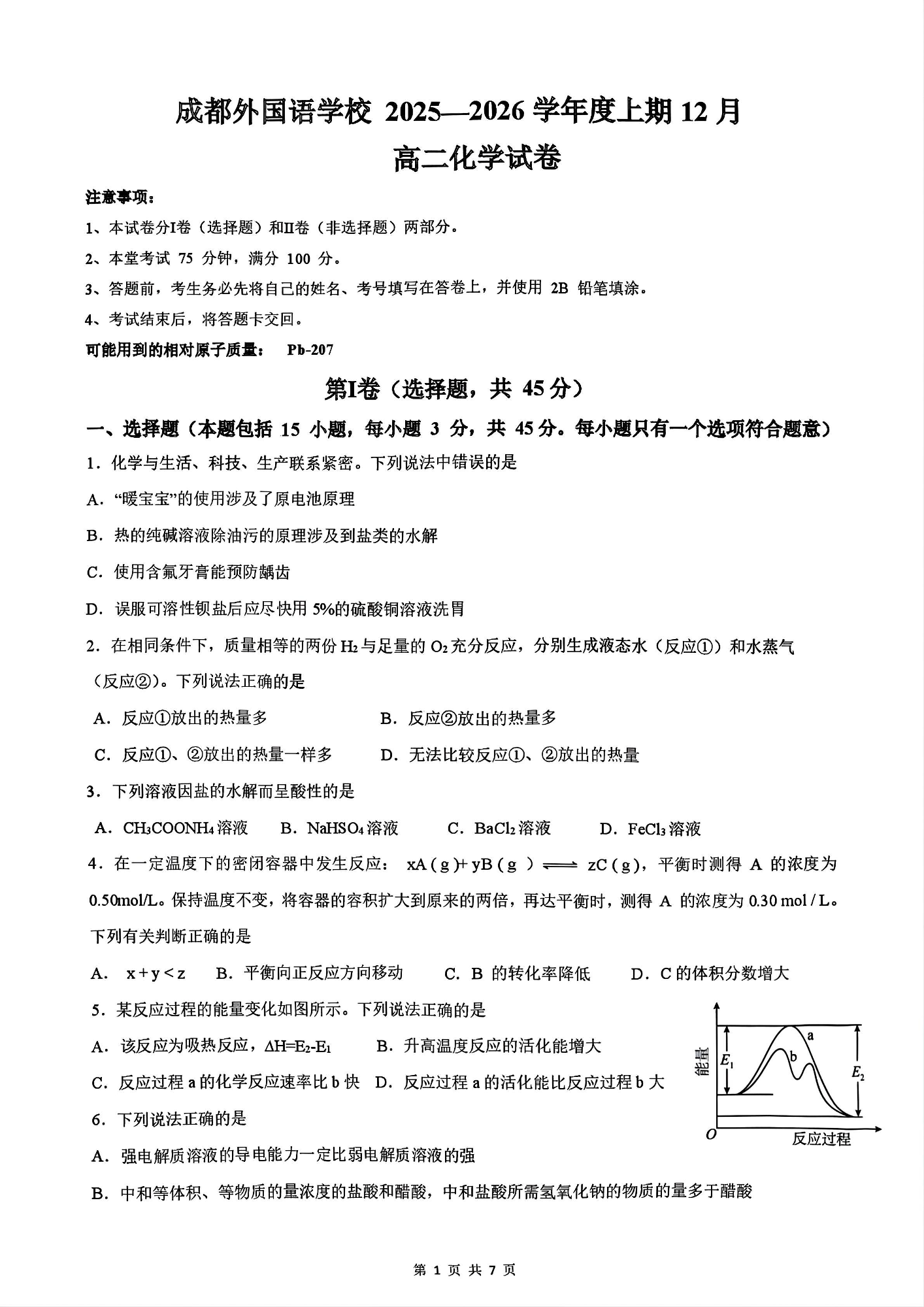 高二化学--四川省成都外国语学校2025-2026学年高二上学期12月月考