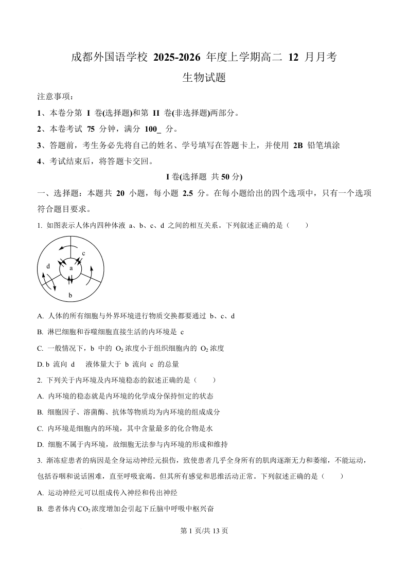 高二生物(原卷版)--四川省成都外国语学校2025-2026学年高二上学期12月月考