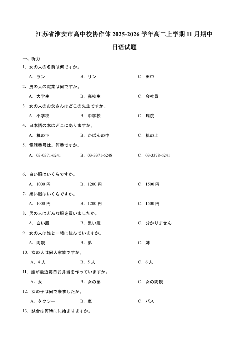 高二日语+答案--江苏省淮安市高中校协作体2025-2026学年高二上学期期中联考