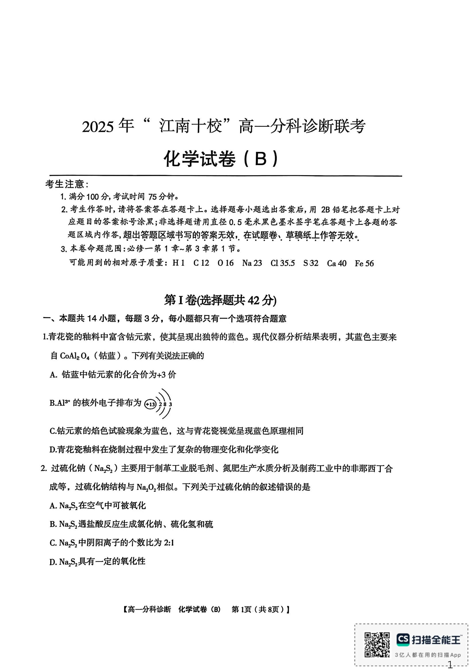 高一化学B--安徽省江南十校2025-2026学年高一上学期12月联考