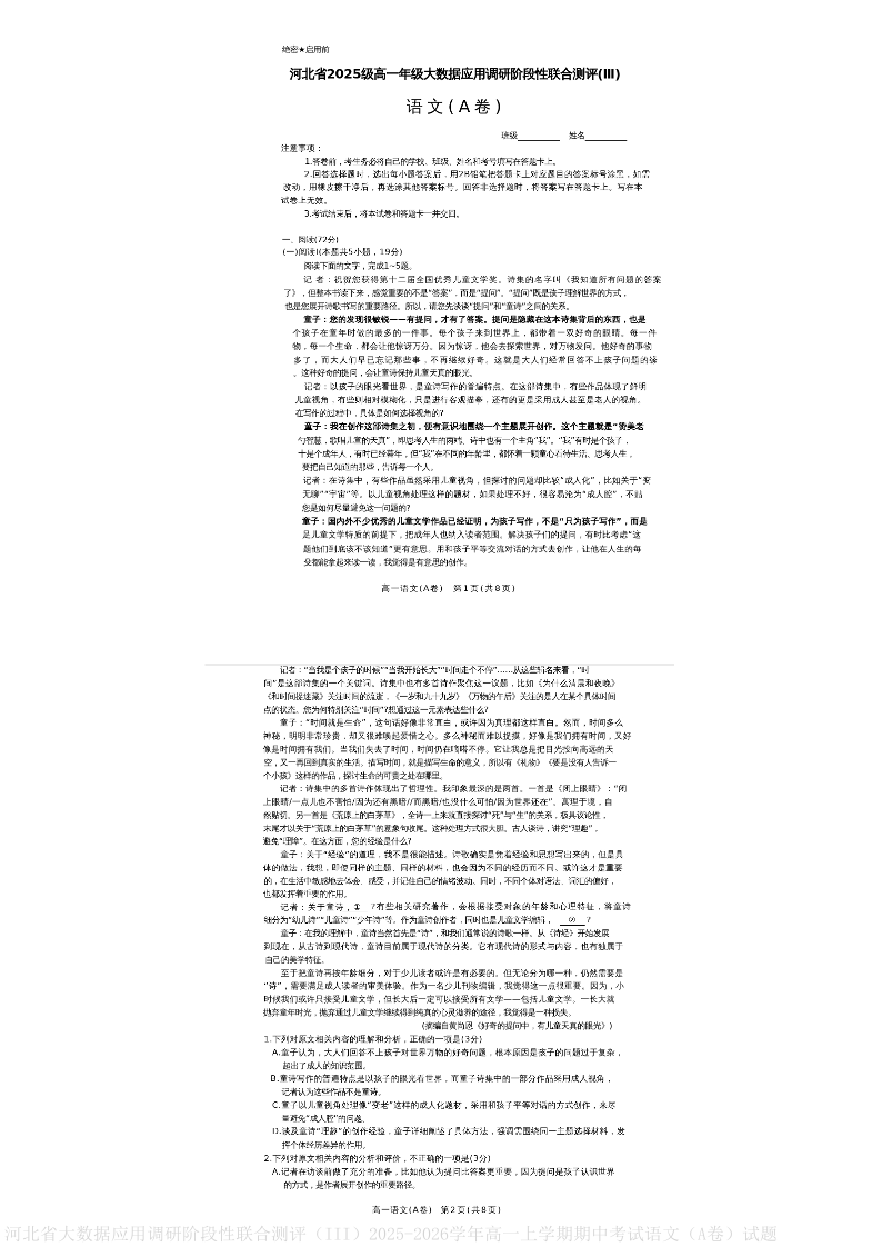 高一语文(A卷)--河北省2025-2026学年高一上学期大数据应用调研联合测评(Ⅲ)