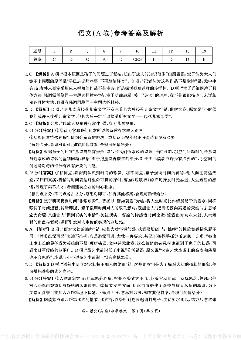 高一语文(A卷)答案--河北省2025-2026学年高一上学期大数据应用调研联合测评(Ⅲ)