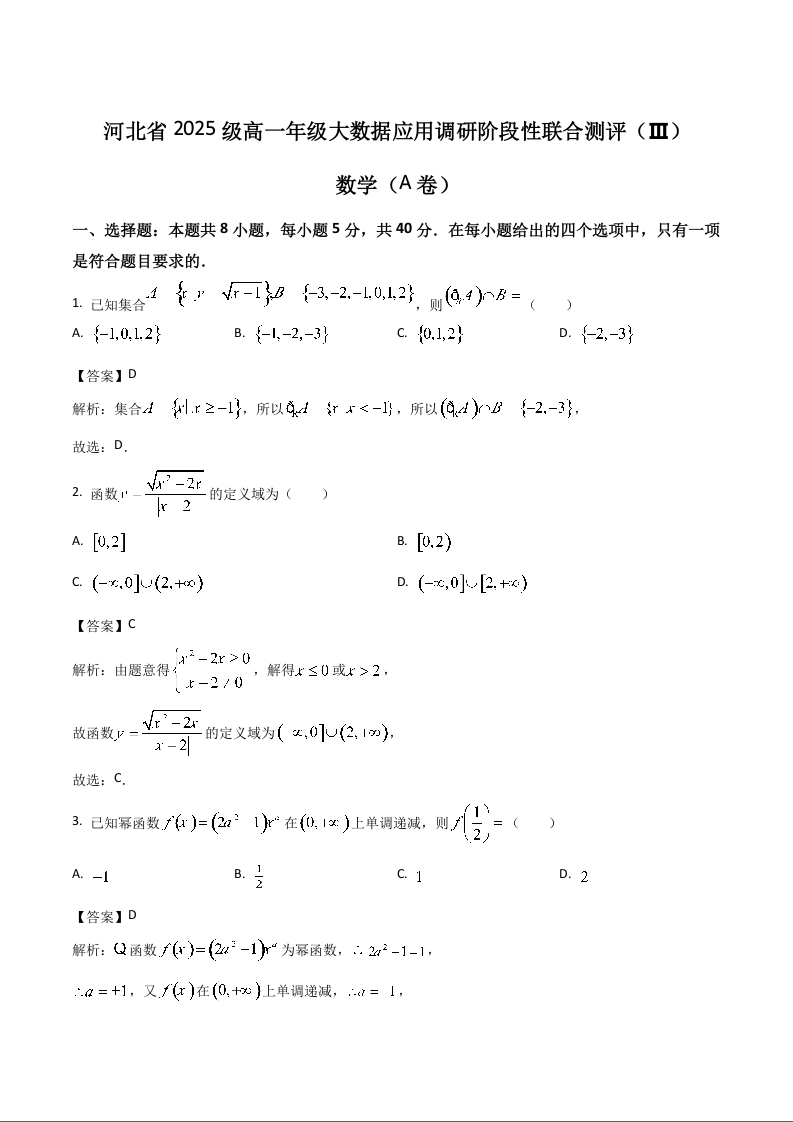 高一数学+答案--河北省2025-2026学年高一上学期大数据应用调研联合测评(Ⅲ)