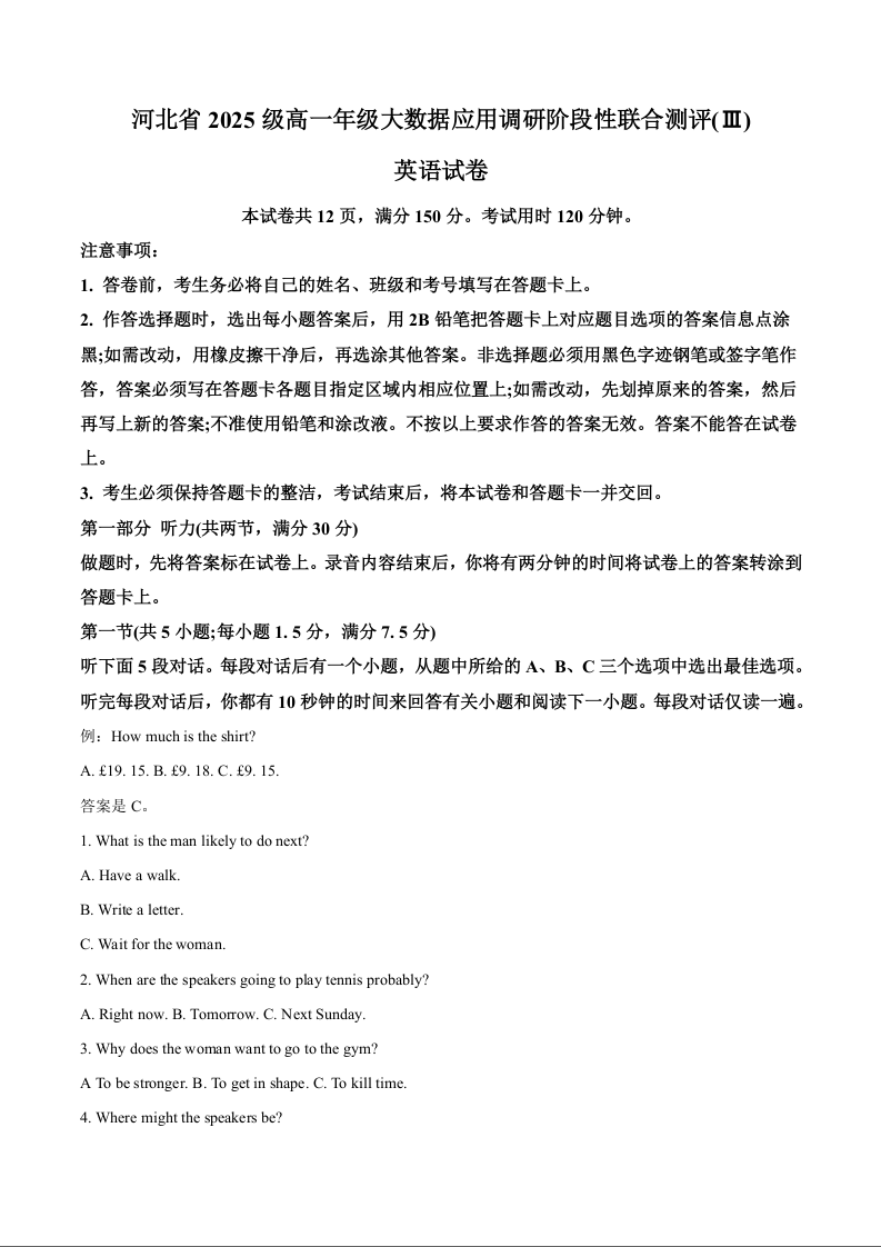 高一英语+答案--河北省2025-2026学年高一上学期大数据应用调研联合测评(Ⅲ)