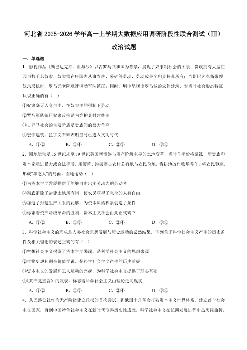 高一政治+答案--河北省2025-2026学年高一上学期大数据应用调研联合测评(Ⅲ)