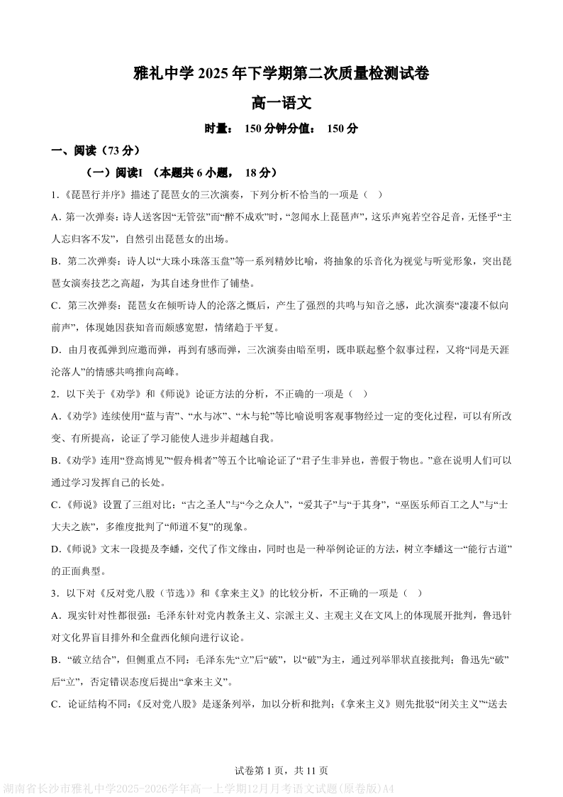 高一语文(原卷版)--湖南省长沙市雅礼中学2025-2026学年高一上学期第二次质量检测