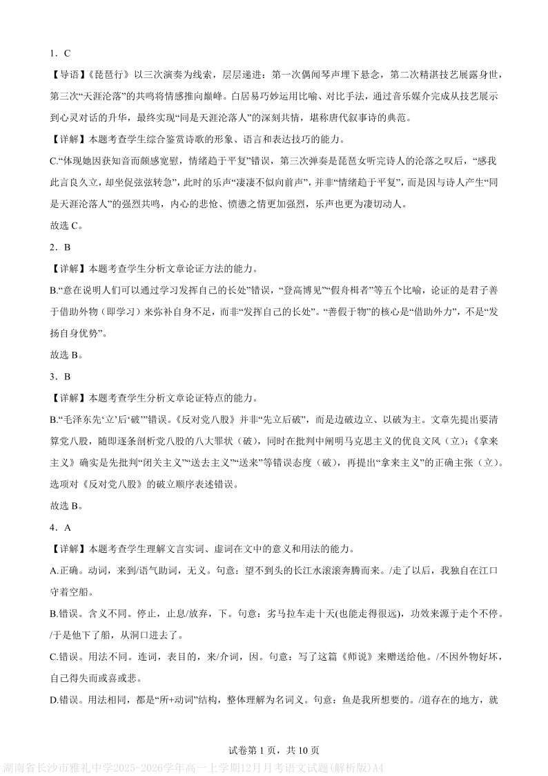 高一语文(解析版)--湖南省长沙市雅礼中学2025-2026学年高一上学期第二次质量检测