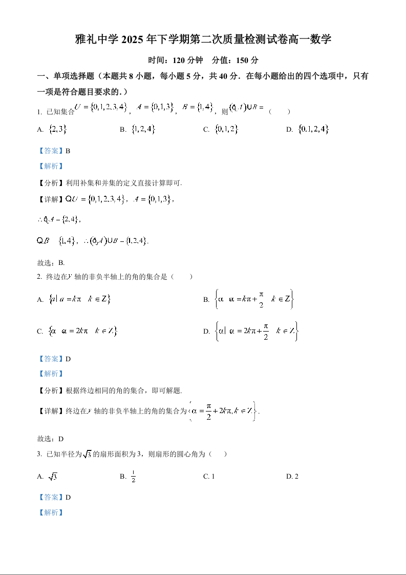 高一数学(解析版)--湖南省长沙市雅礼中学2025-2026学年高一上学期第二次质量检测