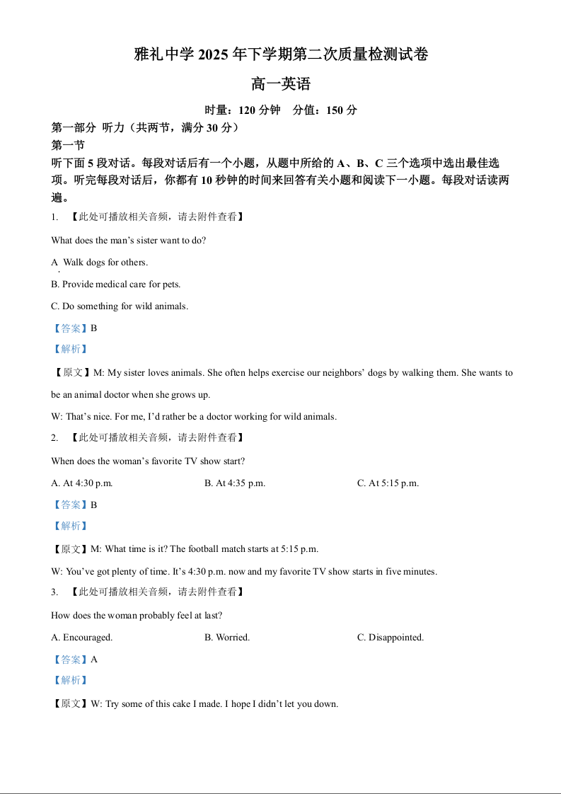 高一英语(解析版)--湖南省长沙市雅礼中学2025-2026学年高一上学期第二次质量检测