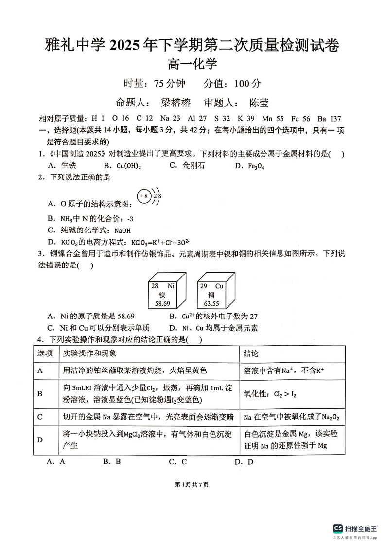 高一化学--湖南省长沙市雅礼中学2025-2026学年高一上学期第二次质量检测