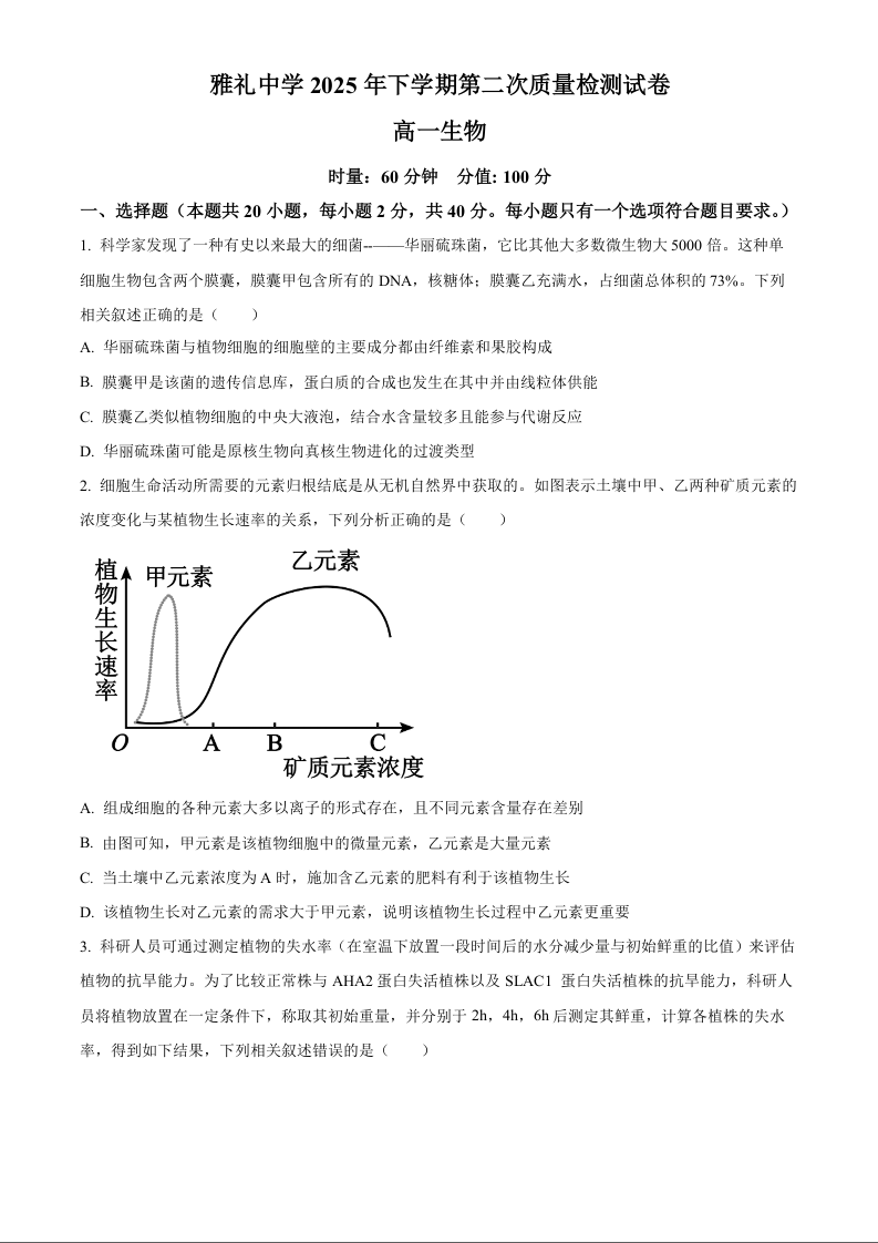 高一生物(原卷版)--湖南省长沙市雅礼中学2025-2026学年高一上学期第二次质量检测