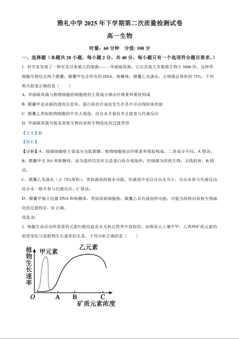 高一生物(解析版)--湖南省长沙市雅礼中学2025-2026学年高一上学期第二次质量检测