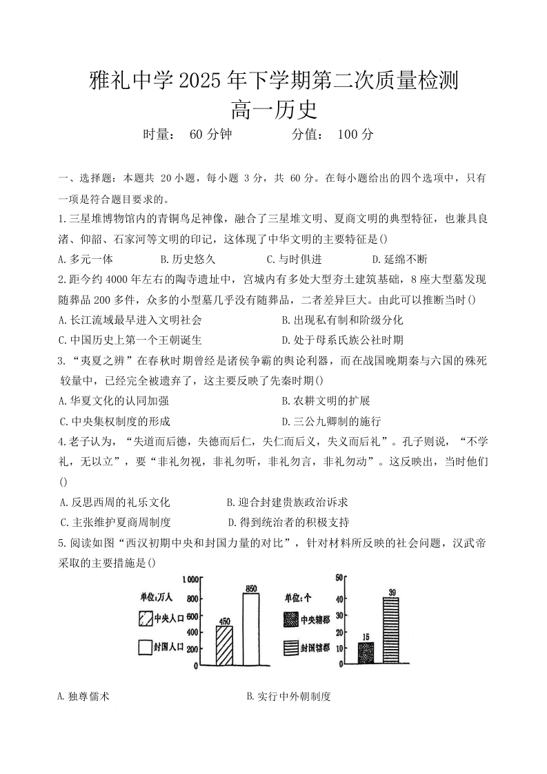 高一历史+答案--湖南省长沙市雅礼中学2025-2026学年高一上学期第二次质量检测