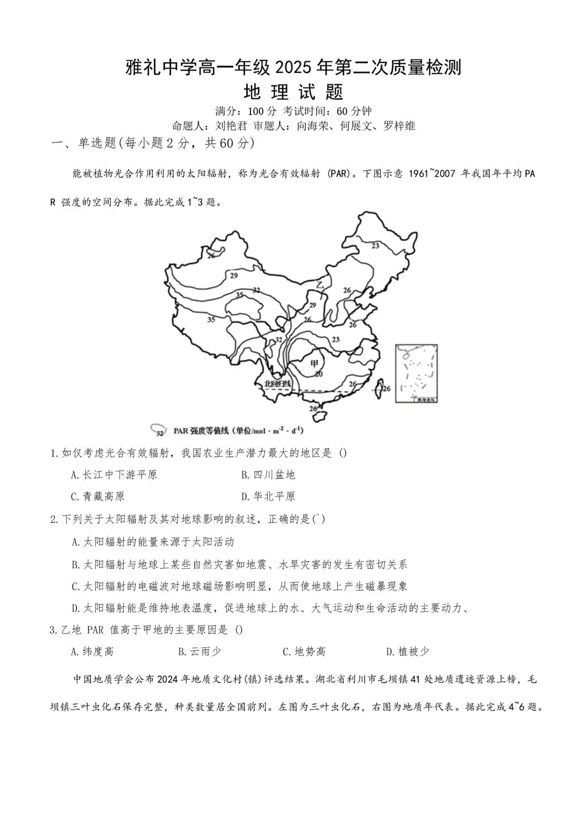 高一地理--湖南省长沙市雅礼中学2025-2026学年高一上学期第二次质量检测
