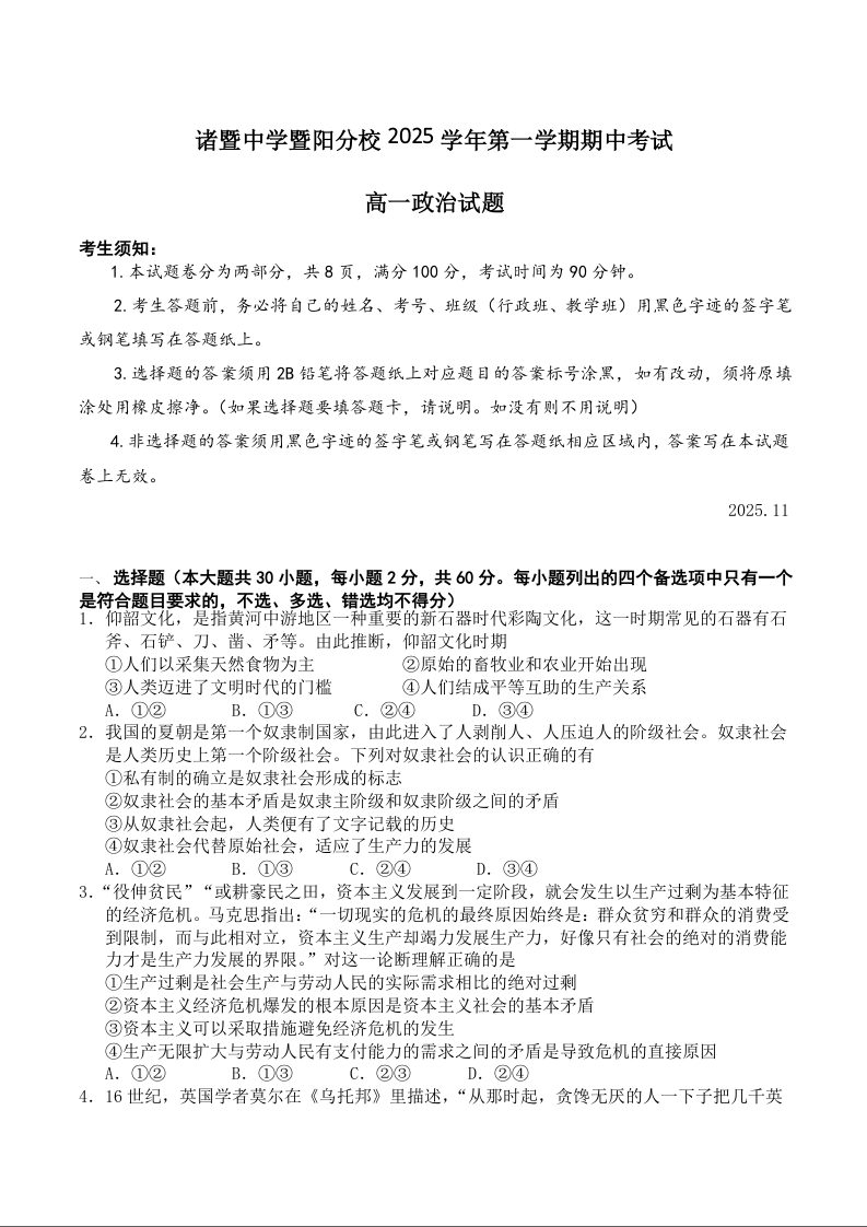 高一政治+答案--浙江省诸暨中学暨阳分校2025-2026学年高一上学期期中考试