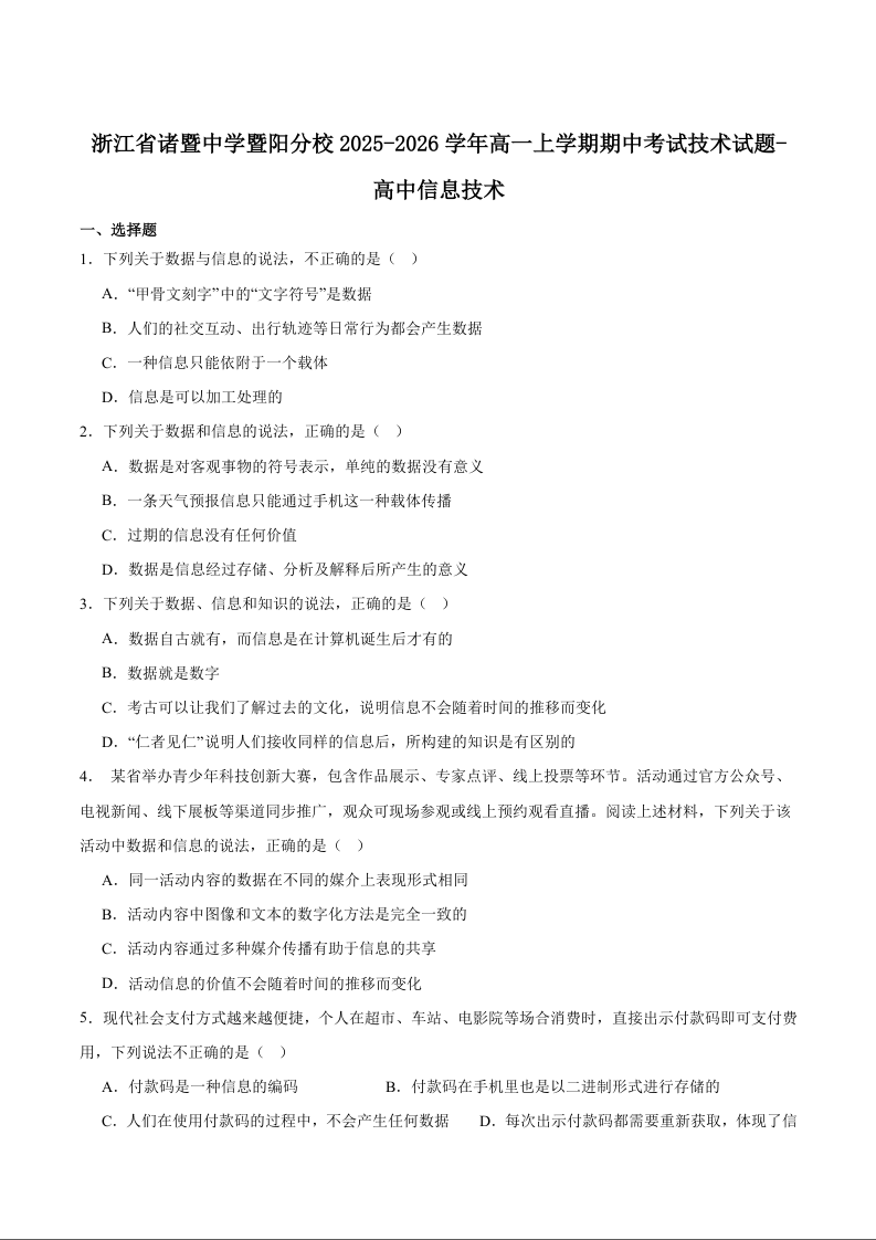 高一信息技术+答案--浙江省诸暨中学暨阳分校2025-2026学年高一上学期期中考试