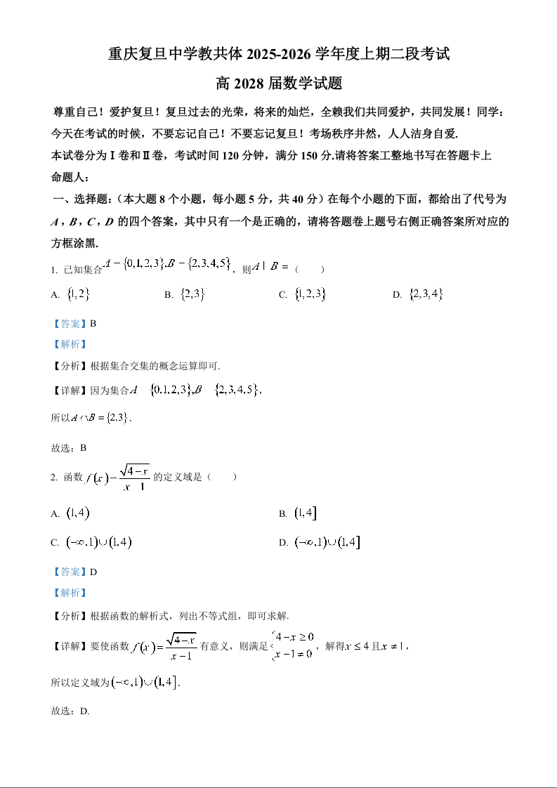 高一数学(解析版)--重庆市复旦中学教共体2025-2026学年高一上学期第二次段考