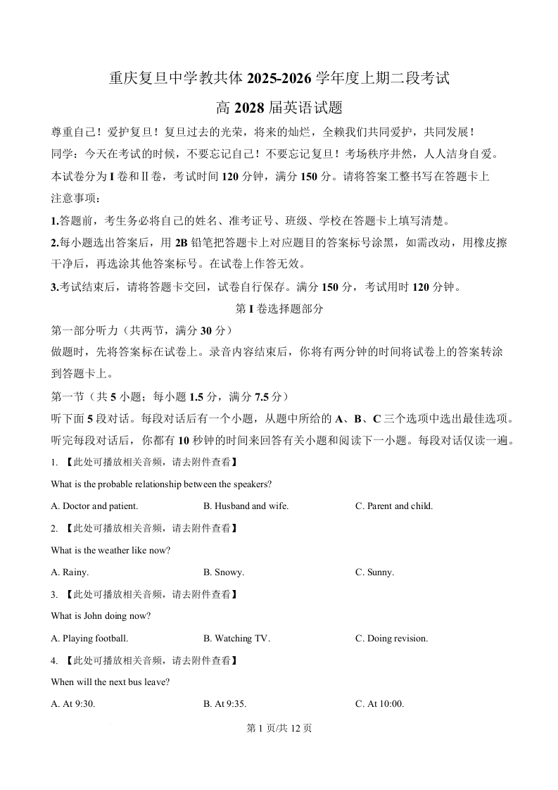 高一英语(解析版)--重庆市复旦中学教共体2025-2026学年高一上学期第二次段考