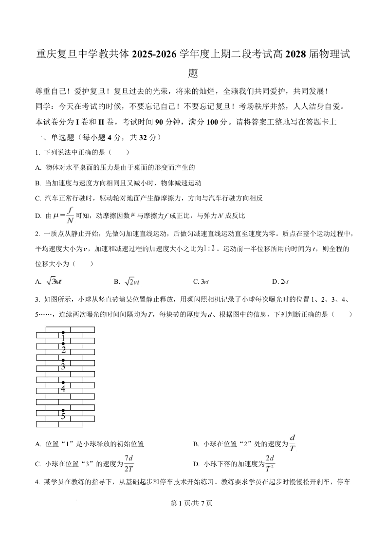 高一物理(原卷版)--重庆市复旦中学教共体2025-2026学年高一上学期第二次段考