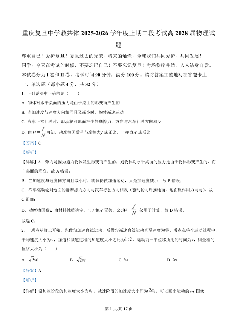 高一物理(解析版)--重庆市复旦中学教共体2025-2026学年高一上学期第二次段考