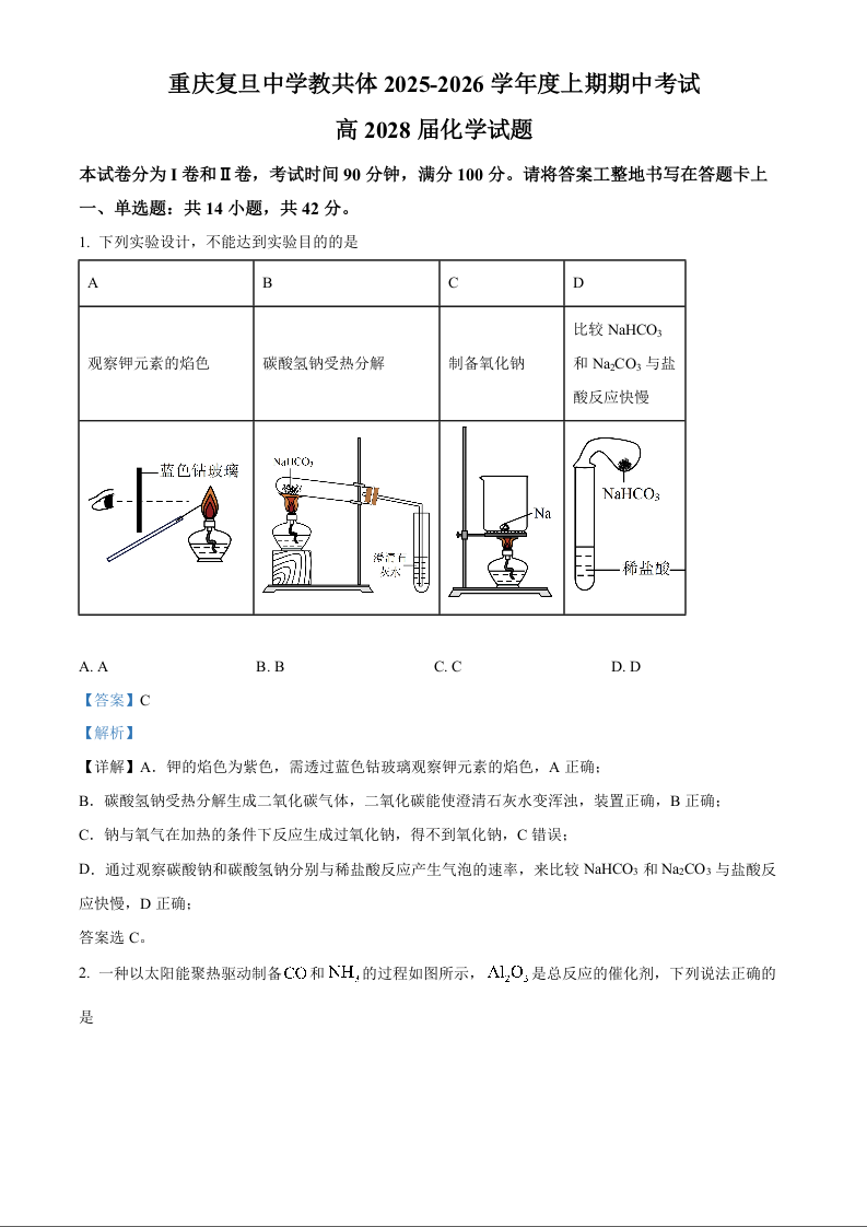 高一化学(解析版)--重庆市复旦中学教共体2025-2026学年高一上学期第二次段考
