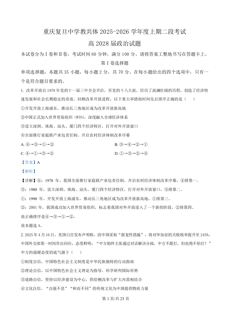 高一政治(解析版)--重庆市复旦中学教共体2025-2026学年高一上学期第二次段考
